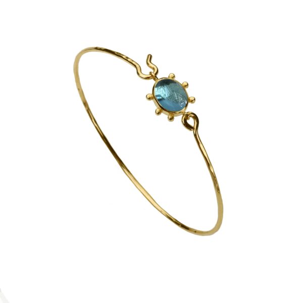 14K yellow gold bracelet with a a mesmerising oval cabochon blue topaz, a stone celebrated for its exceptional clarity, allowing its serene blue tones to shine brilliantly.