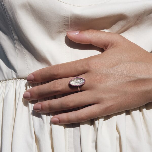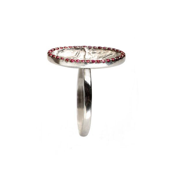 An exquisite silver ring, with its concave emboss presenting “Prince of Lilies”, rooted in the Minoan civilisation. The element is framed by thirty six precious stones set masterfully to create a beautiful color degradation of red and dark pink.