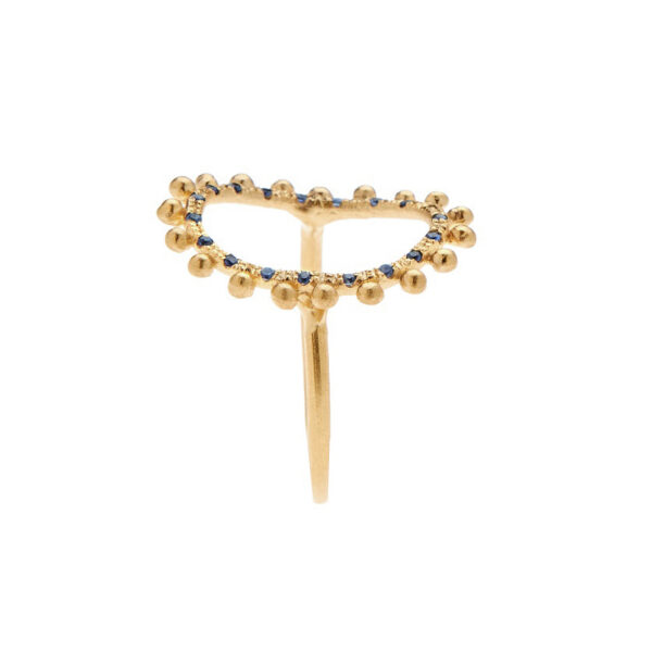 This ring is inspired by the exquisite aesthetics of Rainessance era, expressed through Danai’s abstract designing style. The upper oval part of the ring is bejeweled with nineteen sapphires and forms a gentle curve that embraces the natural shape of the finger. This timeless ring is a piece to treasure and enjoy everyday.